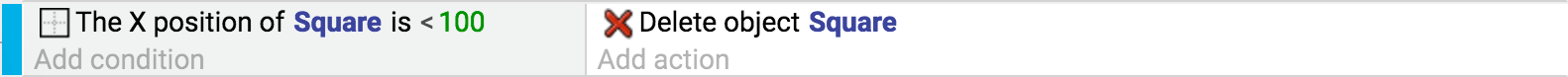 Here is an event that will destroy the "Square" objects whose have a X position which is less than 100 pixels: